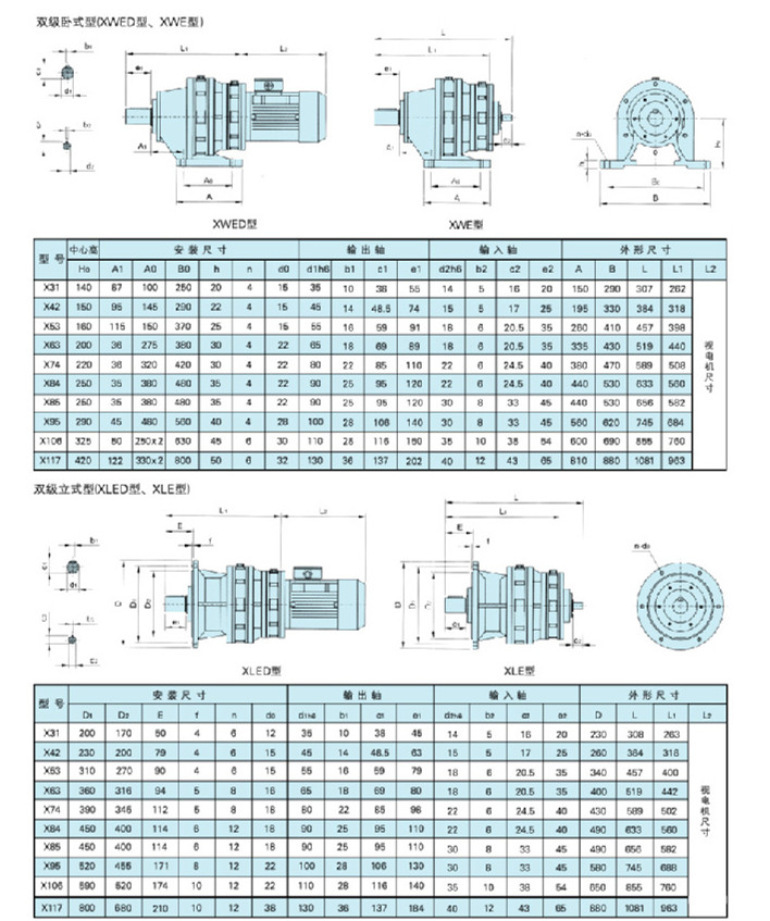 X-42为双极摆线针轮减速机 ,结构形式有:立式、卧式、双轴型、直联型。双级摆线(,,XLED) 机型号有:32、42、53、63、64、74、84、85、95、106、117、118、128,。传动比:1