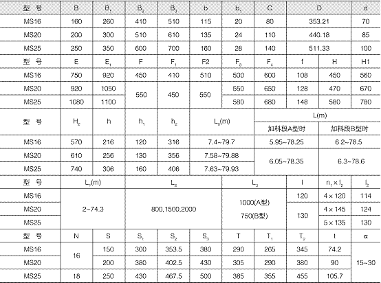 MS型大倾角埋刮板输送机是由MZ埋刮板输送机的下水平部分与上水平部分(中间加一过渡段)组合而成,其链条形式也与MZ型埋刮板输送机相同,此设备适用于15°<α<30°的安装布置。